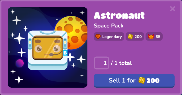 If you happen to acquire the Astronaut, you can sell it for 200 tokens. Moreover, there are other variants of the Astronaut known as Chroma Astronauts (A.K.A. Colored Astronauts), which are available on specific days of the week. These Chroma variants come in different colors and are rarer than the standard Astronaut. Every time you buy a Space Pack, there is a 0.05% chance you get a Chroma from the Space Pack, and if you do, depending on the day of the week, you will get a different color Colored Astronauts.