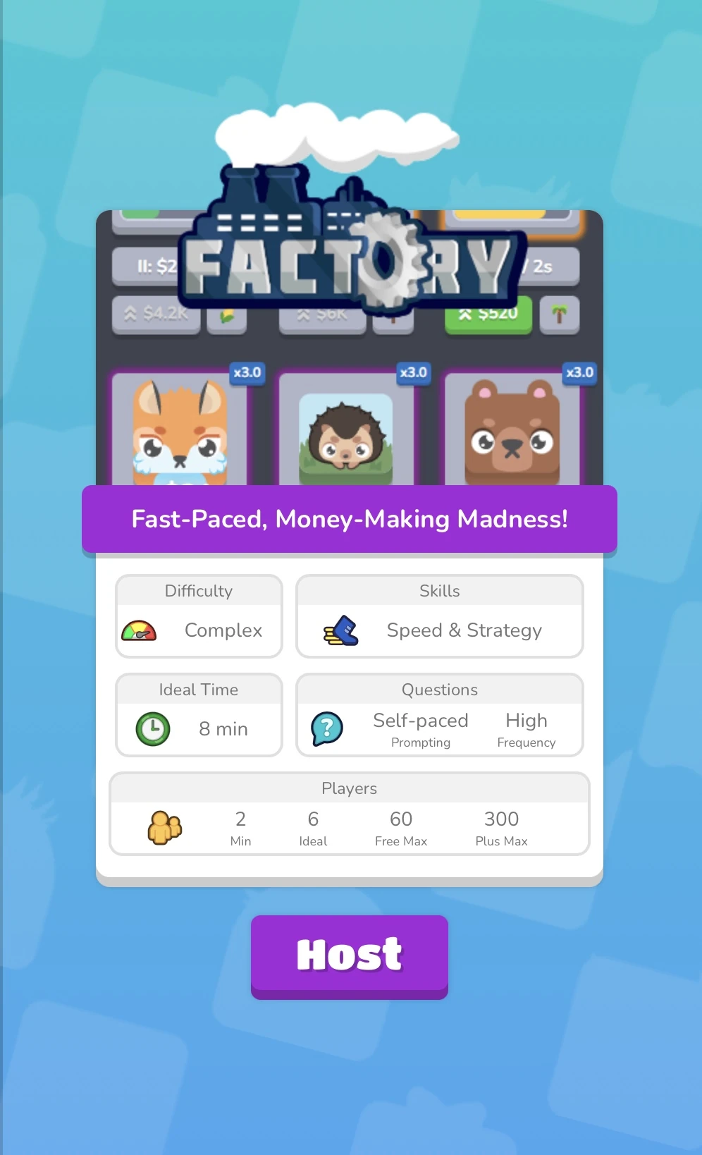 In Factory, your goal is to collect as much money as possible by acquiring different units, each producing money at varying speeds and rates. You must strategically upgrade and manage these units to increase efficiency, balancing resources and automation as you can progress. You can play on Solo, Homework, and Hosting.