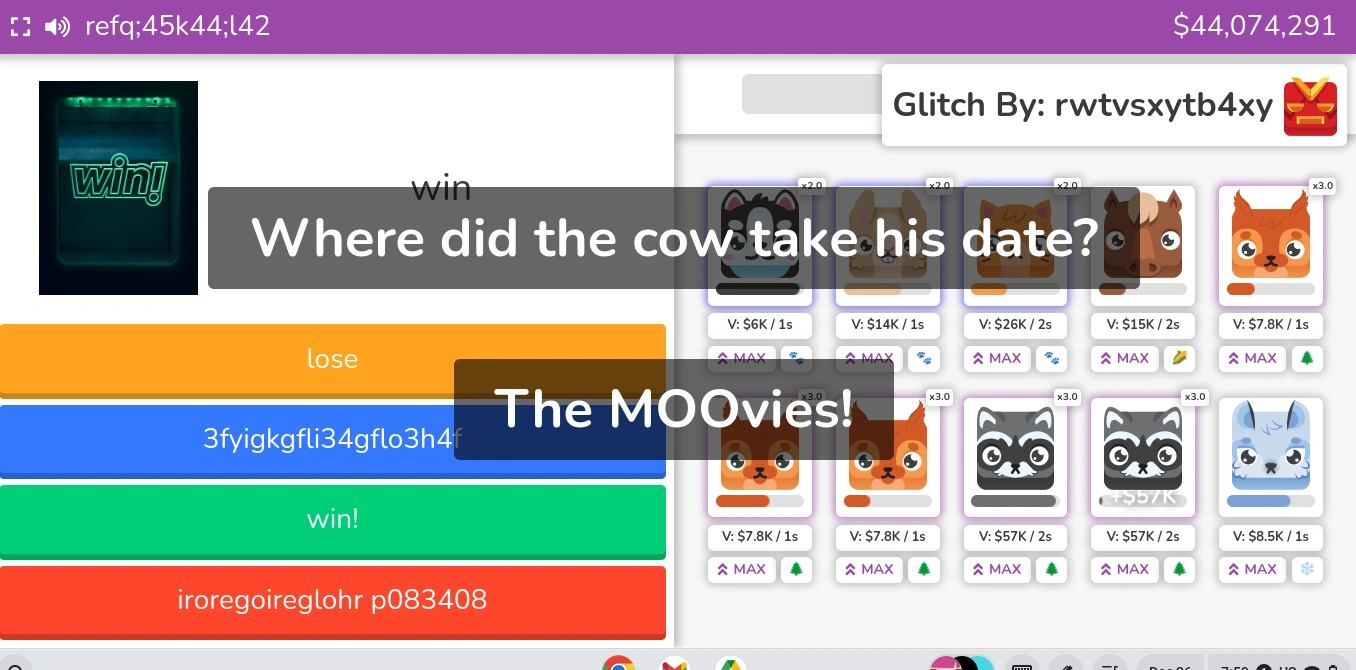 The Jokester Glitch will make everybody's screen have a random joke with its answer, except the player who activates it. Every joke is different and unique, and the chances of you getting the same joke at least twice in the same game are extremely unlikely (below a 1% chance). |