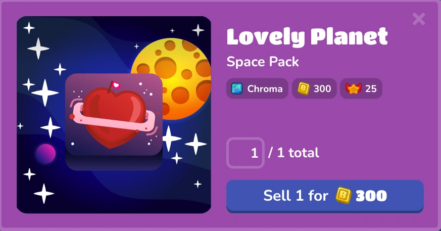 The Lovely Planet is a Chroma Blook released on 2023 Valentine day. It reappeared in Valentines Day on 2024, 2025, with the selling price increased by 500 each year. It has its individual Pack that you could buy for 1500 Tokens and sell it for 300 (Like most of the other Chromas).