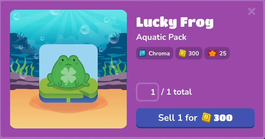 The Lucky Frog is a Chroma Blook, which means that you do not have this Blook by default, and that it can only be unlocked through a Box/Pack. This specific Blook can be only obtained through the Lucky Box. You can sell this Blook for only 300 Tokens, and it's a limited time Blook, since it can be available only on St Patrick's Day Event for 500 Tokens. This Blook was first put in the Market on March 17th, 2022 on St Patrick's Day Event, then returned on March 17, 2023 to be bought for 1,000 Tokens with the Lucky Hamster, and then returned again in 2024 with a new price of 1,500 tokens to be bought with the Leprechaun. It returned again in 2025 with a new price of 2,000 tokens.