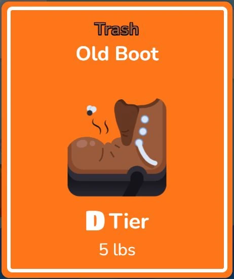 Old Boot is an object that can be hooked on Fishing Frenzy. The rarity of Old Boot is "Trash". It can be found in C, D, or F tier. It has a 15% chance of being hooked up. The weight of Old Boot is in the range from 1 lb to 10 lbs.