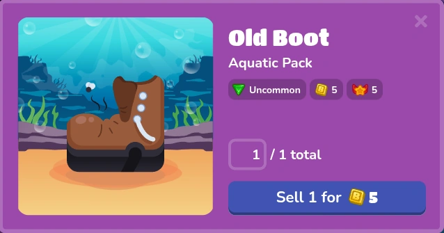 Old Boot is an Uncommon Blook, meaning that you do not have it by default and it must be unlocked through a pack. It can be purchased in the market by opening Aquatic Pack. The drop rate of Old Boot is 15%. It can be sold for 5 tokens each, just like other Uncommons. Its Blook Score value is 5, just like every Uncommon.