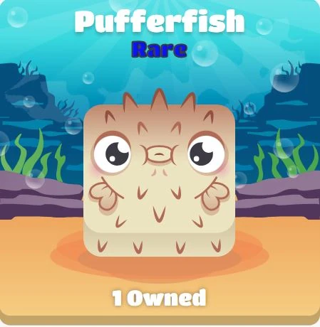 Pufferfish is a Rare Blook that can be purchased in the Market by opening the Aquatic Pack. The drop rate of Pufferfish is 6.1%. It can be sold for 20 tokens each, just like other Rares.