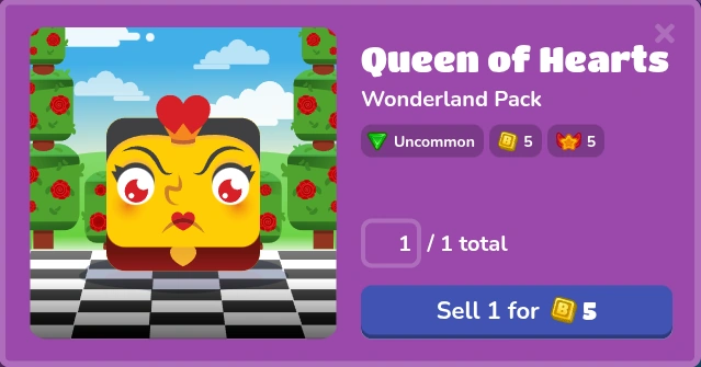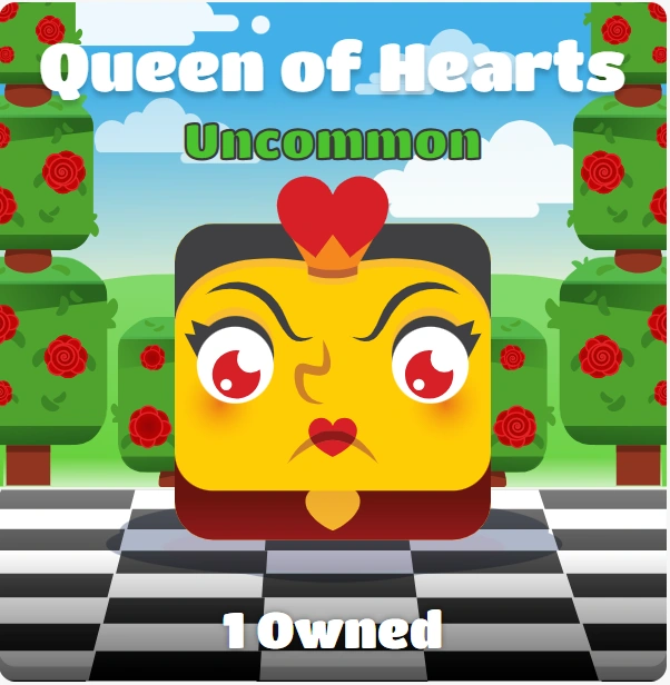 Queen of Hearts is an Uncommon Blook, meaning that you do not have it by default and it must be unlocked through a pack. This Blook can be obtained in the Wonderland Pack. The drop rate of Queen of Hearts is 15%. It can be sold for 5 tokens each, just like other Uncommons. Its Blook Score value is 5, just like every Uncommon.