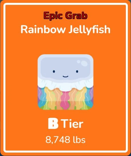 Rainbow Jellyfish is an fish that can be caught in Fishing Frenzy. The rarity of Rainbow Jellyfish is "Epic Grab". It can be found in A, B, or C tier, with an 8% chance of being caught. The weight of Rainbow Jellyfish could be in the range from 7000 lbs to 10000 lbs.