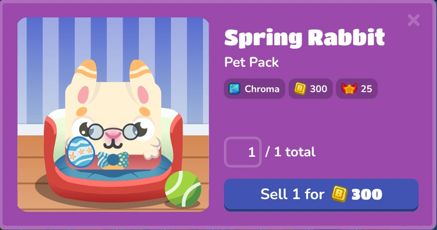 Spring Rabbit is a Chroma. This means that it must be unlocked through a pack and you do not have it by default. This blook was released on March 30th, 2024 (when Blooket reset at 8:00) alongside the Spring Frog, Chocolate Rabbit and Spring Deer as part of the Easter event. It could have been bought in the Market for 500 tokens, it is sold for 300 tokens, and it gives you a Blook Score value of 25