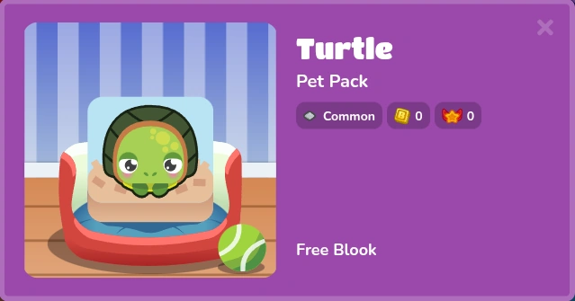 Turtle is a Common Blook, meaning that everyone has it by default, and it cannot be sold. This Blook is included in the Pet Pack.