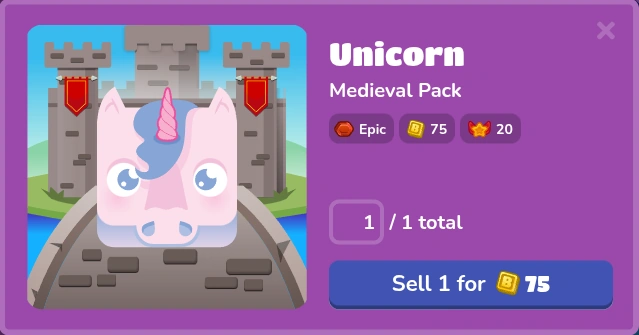 The Unicorn is an Epic Blook , which means that you did not have this Blook by default, and that it must be unlocked through the Medieval Pack. The Unicorn has a 5% drop rate, and can be sold for 75 Tokens. This Blook is currently featured in the game-modes Tower Defense (TD), Tower of Doom (TOD), Factory, Crazy Kingdom, Gold Quest, and Tower Defense 2 (TD2). Its Blook Score is 20, just like every other Epic.
