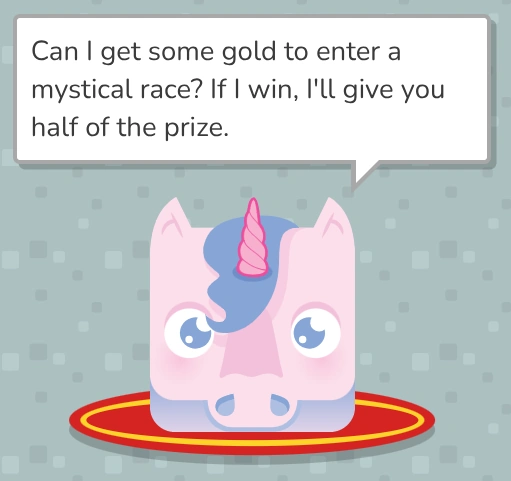 - "Can I get some gold to enter a mystical race? If I win, I'll give you half of the prize."