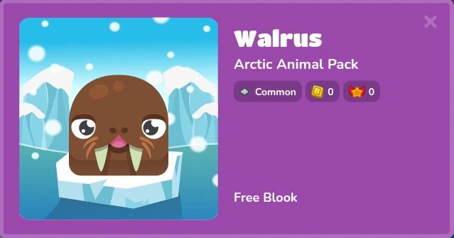 The Walrus is a Common Blook, meaning that everyone has it by default, and it cannot be sold. This Blook is part of the Arctic Animal Pack.